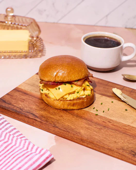 Sweet, savory, and irresistibly comforting, this Maple Bacon Egg Breakfast Sandwich turns your morning into something special. Crispy maple-glazed bacon, fluffy cheesy eggs, and our tasty Sriracha Brioche Bun come together in perfect harmony. Itβs the perfect breakfast indulgence made to start your day with a smile.