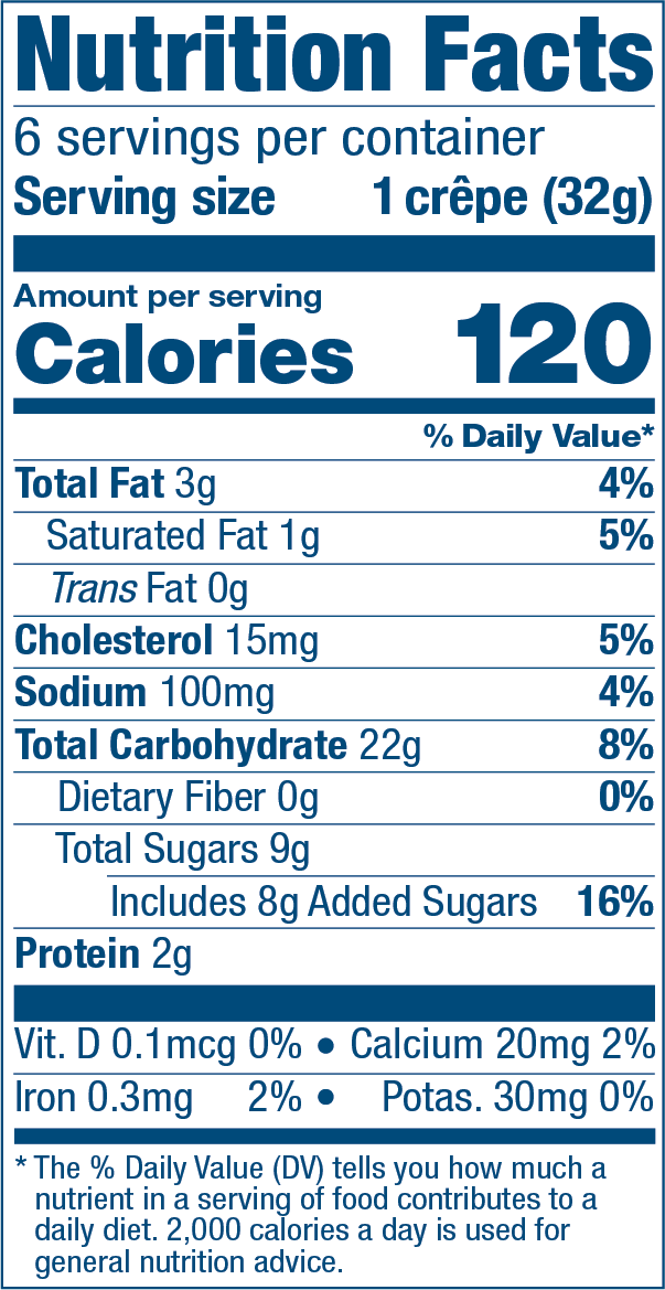 Our tasty blueberry crêpes have a shelf life of 30 days, and can be stored at room temperature.